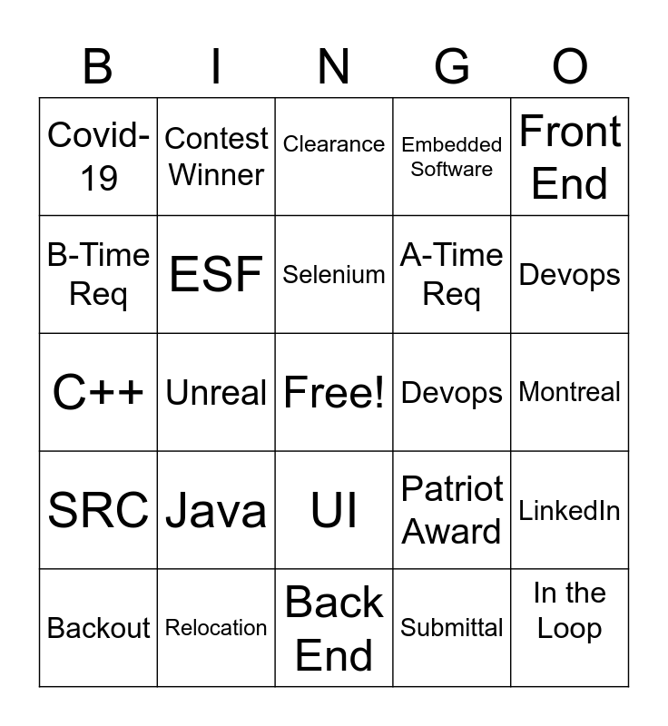 This bingo card has a free space and 44 words: G2, In the Loop, Internal Interview, Backout, ProA, Submittal, Clearance, Redeploy, Front End, Relocation, Embedded Software, Devops, UI, Java, My Lists, Back End, B Candidate, C++, Baltimore, Devops, Contest Winner, Red Zone, Start!, Covid-19, Toronto, Montreal, Spread, EBR's, Patriot Award, SRC, Job Postings, LinkedIn, Connected, c#, Unreal, Microprocessors, Linux, Kubernetes, Selenium, B-Time Req, A-Time Req, Work from Home, ESF and Indeed.