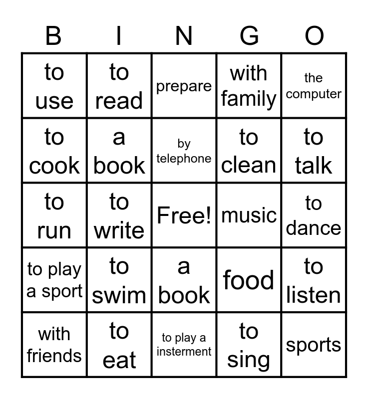 This bingo card has a free space and 24 words: to swim, to eat, by telephone, with friends, the computer, to use, to cook, to read, music, a book, to clean, to run, food, to listen, a book, to sing, to dance, prepare, to talk, to write, sports, to play a sport, with family and to play a insterment.