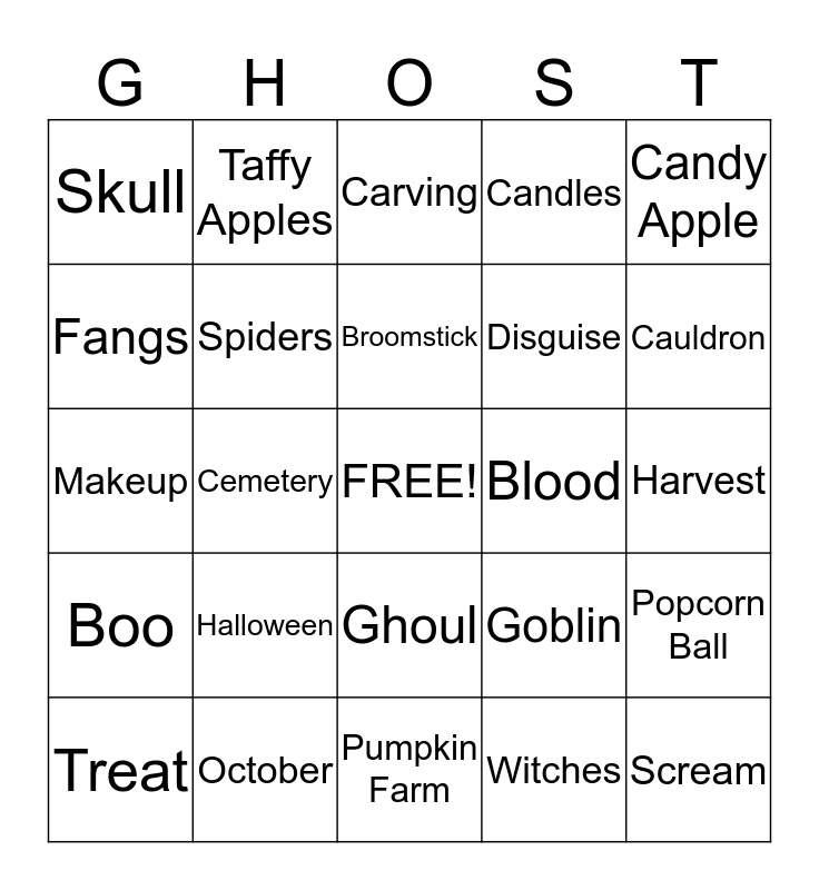 This bingo card has a free space and 24 words: Halloween, October, Broomstick, Treat, Candy Apple, Skull, Fangs, Taffy Apples, Blood, Ghoul, Disguise, Makeup, Goblin, Popcorn Ball, Spiders, Witches, Harvest, Carving, Cauldron, Cemetery, Scream, Boo, Candles and Pumpkin Farm.