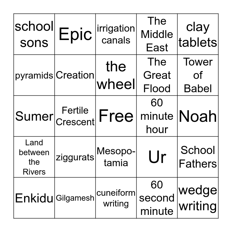 This bingo card has a free space and 24 words: ziggurats, Gilgamesh, the wheel, Enkidu, clay tablets, school sons, pyramids, Epic, 60 minute hour, Mesopo- tamia, The Great Flood, Sumer, Ur, School Fathers, Creation, 60 second minute, Noah, irrigation canals, Tower of Babel, Fertile Crescent, wedge writing, Land between the Rivers, The Middle East and cuneiform writing.