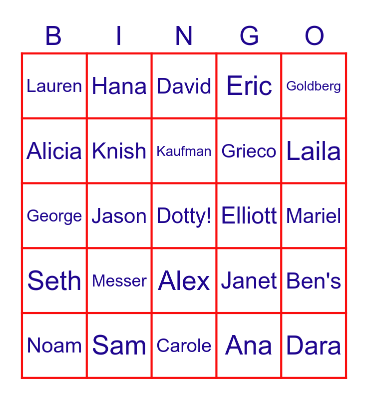 This bingo card has a free space and 38 words: Matza Ball, Brisket, Turkey, Knish, Ben's, Messer, Kaufman, Guarrera, Goldberg, Grieco, Jason, Eric, Dara, Mariel, Alicia, Seth, Leah, David, Alana, Elliott, Lauren, Sam, Laila, Noam, Jackie, Carole, Bill, Vin, Hal, Matt, Rubinio, Alex, Ana, Hana, Rebecca, Janet, George and Dennis.