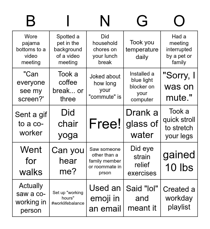 This bingo card has a free space and 24 words: Actually saw a co-working in person, Can you hear me?, Joked about how long your "commute" is, Said "lol" and meant it, Had a meeting interrupted by a pet or family, Wore pajama bottoms to a video meeting, Spotted a pet in the background of a video meeting, Did household chores on your lunch break, Drank a glass of water, Took a quick stroll to stretch your legs, Sent a gif to a co-worker, Took a coffee break... or three, Did eye strain relief exercises, gained 10 lbs, "Can everyone see my screen?', Set up "working hours" #worklifebalance, Used an emoji in an email, Took you temperature daily, "Sorry, I was on mute.", Went for walks, Did chair yoga, Saw someone other than a family member or roommate in prson, Installed a blue light blocker on your computer and Created a workday playlist.