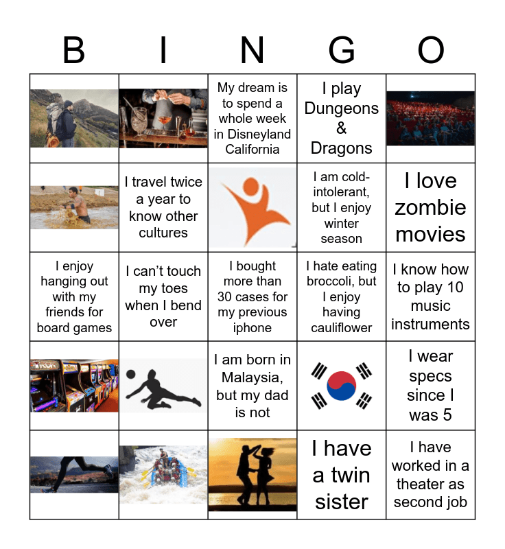 This bingo card has 11 images and 14 words: I hate eating broccoli, but I enjoy having cauliflower, I am born in Malaysia, but my dad is not, I am cold-intolerant, but I enjoy winter season, I enjoy hanging out with my friends for board games, I wear specs since I was 5, I travel twice a year to know other cultures, I have worked in a theater as second job, I know how to play 10 music instruments, My dream is to spend a whole week in Disneyland California, I love zombie movies, I can’t touch my toes when I bend over, I bought more than 30 cases for my previous iphone, I play Dungeons & Dragons and I have a twin sister.