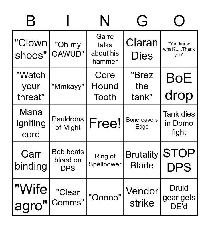 This bingo card has a free space and 49 words: Duplicate Binding, Druid gear gets DE'd, Someone falls in lava, "Ooooo", Bob beats blood on DPS, "Zug Zug", "Oh my GAWUD", Accidental Pull, "Watch your threat", "Hit", "Mmkayy", Ciaran Dies, STOP DPS, Brutality Blade, Duplicate Binding, Perditions Blade, Core Hound Tooth, Bonereavers Edge, "Loot the hound", "You know what?.....Thank you", Pauldrons of Might, Vendor strike, "Clown shoes", "Brez the tank", Ace gets drunk, BoE drop, "Wife agro", Quickstrike Ring, Ring of Spellpower, Garr binding, Lawbringer Boots, Nightslayer Chest, OS Roll, Legplates of Might, "Clear Comms", Yeeted by surger into lava, Band of Accuria, Sulfurons adds get healed, Tank dies in Domo fight, Someone breaks a sheep, Spinal Reaper, Mageblade, Someone PR dumps, Ace mixes up his symbols, Mana Igniting cord, Garre talks about his hammer, "Pop a fap", Someone asks Curaga for a pot and Rythan shows up.