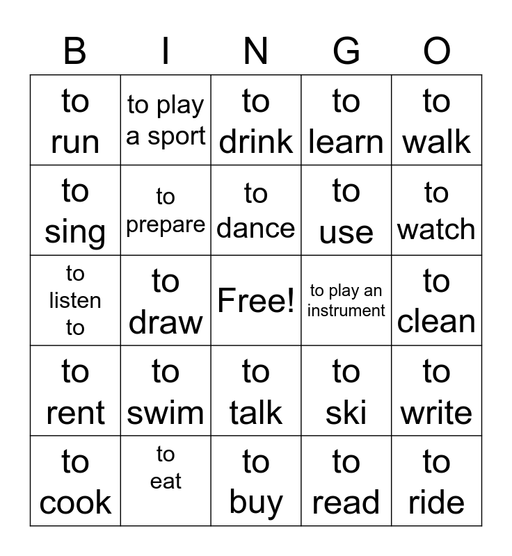 This bingo card has a free space and 24 words: to swim, to eat, to dance, to cook, to walk, to run, to sing, to play a sport, to play an instrument, to talk, to use, to listen to, to ski, to write, to prepare, to read, to clean, to drink, to watch, to draw, to ride, to rent, to learn and to buy.