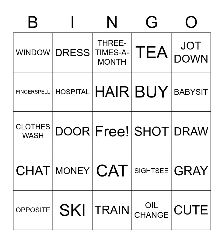 This bingo card has a free space and 65 words: BLACK, RED, PINK, GRAY, PANTS, SKIRT, DRESS, HAT, HAIR, GLASSES, CAT, JACKET, DRAW, JOT DOWN, HOMEWORK, FINGERSPELL, DOOR, WINDOW, SHOPPING, BUY, MONEY, CHAT, TEA, WARM, YELL, HOT, SICK, 67-YEARS-OLD, CUTE, LOOK-LIKE, OPPOSITE, DIFFERENT, WEDDING, GATHER, SIGHTSEE, SKI, DRY CLEAN, CLOTHES WASH, OIL CHANGE, MEDICINE, HOSPITAL, DOCTOR, SHOT, FIX, PLATE/DISH, GO-OUT, BABYSIT, FEED, RESTURANT, MEETING, MONEY WITHDRAW, SOCCER, PRACTICE, TRAIN, STORE, SELL, ONCE-A-WEEK, THREE-TIMES-A-MONTH, TOMORROW, MORNING, DAY, AFTERNOON, NIGHT, WHITE and LIKE.