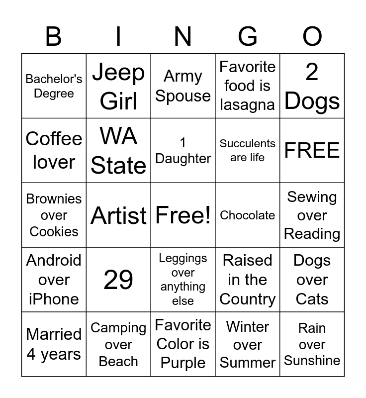 This bingo card has a free space and 25 words: 29, Favorite Color is Purple, 1 Daughter, Married 4 years, 2 Dogs, Bachelor's Degree, Coffee lover, Jeep Girl, Chocolate, Leggings over anything else, Succulents are life, Brownies over Cookies, Raised in the Country, Dogs over Cats, WA State, 0 Sons, Sewing over Reading, Army Spouse, FREE, Artist, Rain over Sunshine, Camping over Beach, Android over iPhone, Favorite food is lasagna and Winter over Summer.