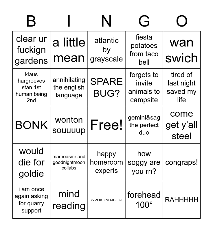 This bingo card has a free space and 24 words: marnoasmr and goodnightmoon collabs, mind reading, SPARE BUG?, i am once again asking for quarry support, wan swich, clear ur fuckign gardens, klaus hargreeves stan 1st human being 2nd, a little mean, gemini&sag the perfect duo, happy homeroom experts, forgets to invite animals to campsite, BONK, how soggy are you rn?, congraps!, annihilating the english language, forehead 100°, come get y’all steel, atlantic by grayscale, tired of last night saved my life, wonton souuuup, RAHHHHH, would die for goldie, fiesta potatoes from taco bell and WVDKDNDJFJDJ.