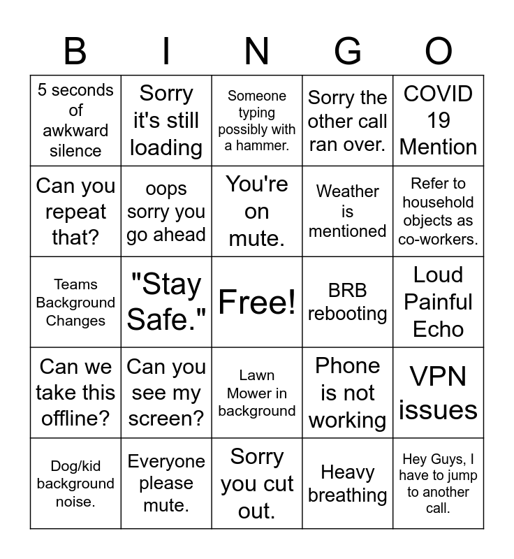 This bingo card has a free space and 24 words: Can you see my screen?, Everyone please mute., You're on mute., Dog/kid background noise., COVID 19 Mention, 5 seconds of awkward silence, Can you repeat that?, Sorry it's still loading, BRB rebooting, Lawn Mower in background, Weather is mentioned, Teams Background Changes, Phone is not working, VPN issues, oops sorry you go ahead, Heavy breathing, Loud Painful Echo, Someone typing possibly with a hammer., Refer to household objects as co-workers., "Stay Safe.", Hey Guys, I have to jump to another call., Can we take this offline?, Sorry the other call ran over. and Sorry you cut out..
