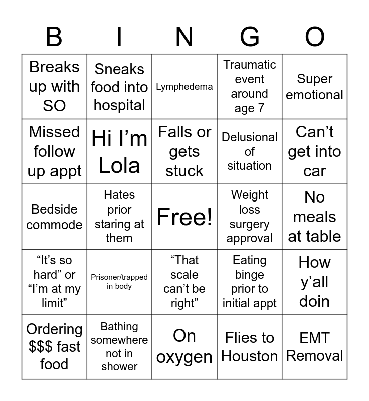 This bingo card has a free space and 49 words: Trashy tattoos, EMT Removal, No shoes, On oxygen, Prisoner/trapped in body, Denies cheating on diet, Sneaks food into hospital, Hernia or gallstones, Missed follow up appt, One mont, Hi I’m Lola, Traumatic event around age 7, How y’all doin, Eating binge prior to initial appt, Gained weight on diet, Dr. Now proud, Falls or gets stuck, Weight loss surgery approval, Didn’t lose weight bc of stress, Super emotional, Hates prior staring at them, Flies to Houston, Breaks up with SO, Delusional of situation, From OK, WA, TX, OH, LA, Can’t get into car, Ordering $$$ fast food, Cassandra appears, “That scale can’t be right”, “It’s so hard” or “I’m at my limit”, “I need to eat”, Little shit dog, “I don’t know how it got this bad”, “I know my body”, Bathing somewhere not in shower, Biscuits in gravy, Paper and plastic utensils, Bare mattress no sheets, No meals at table, Hotdogs as breakfast sausages, Cinderblock bed, I hope Dr. Now sees how hard I’ve been working, 3,000 calorie salad, Actually meets “goal”, Bedside commode, Lymphedema, Surgery couldn’t be completed, Doesn’t understand how they gained weight and “I hope I get approved for surgery”.