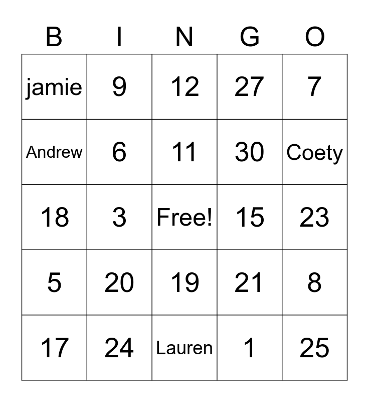 This bingo card has a free space and 32 words: 1, 2, 3, 4, 5, 6, 7, 8, 9, 10, 11, 12, 13, 14, 15, 16, 17, 18, 19, 20, 21, 22, 23, 24, 25, 27, 30, Andrew, jamie, Lauren, Cy and Coety.