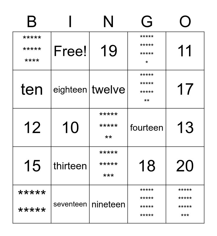 This bingo card has a free space and 33 words: ***** ***** *****, fifteen, 10, sixteen, 15, eighteen, 11, ***** *****, Free!, 14, twelve, 19, ***** ***** *, 16, fourteen, 17, seventeen, 12, thirteen, 18, ***** ***** ***, eleven, ***** ***** ****, 13, nineteen, ***** ***** ***** ***, ***** ***** ***** *, ***** ***** ***** **, ten, 20, twenty, ***** ***** ***** ***** and ***** ***** ***** ****.
