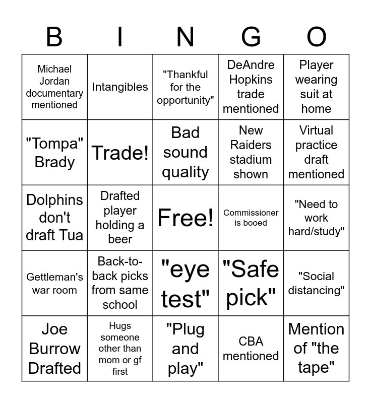 This bingo card has a free space and 27 words: "Safe pick", "Proven Winner", New Raiders stadium shown, "Plug and play", "Tompa" Brady, "Thankful for the opportunity", Intangibles, Gettleman's war room, Commissioner is booed, "Social distancing", Dolphins don't draft Tua, DeAndre Hopkins trade mentioned, Joe Burrow Drafted, Hugs someone other than mom or gf first, Virtual practice draft mentioned, Technical difficulties pauses clock, Trade!, Bad sound quality, Back-to-back picks from same school, Michael Jordan documentary mentioned, "Need to work hard/study", CBA mentioned, Drafted player holding a beer, Mention of "the tape", "eye test", Player wearing suit at home and Player wearing t-shirt.