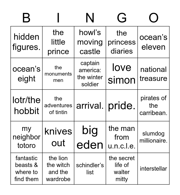 This bingo card has a free space and 34 words: big hero 6, the secret life of walter mitty, booksmart, how to train your dragon, my neighbor totoro, the monuments men, ocean’s eleven, fantastic beasts & where to find them, the little prince, thor: ragnarok, captain america: the winter soldier, howl’s moving castle, wonder woman, star trek (2009), pride., national treasure, the lion the witch and the wardrobe, lotr/the hobbit, knives out, the man from u.n.c.l.e., big eden, three billboards outside ebbing, missouri, hidden figures., pirates of the carribean., schindler’s list, interstellar, the princess diaries, the sound of music, love simon, ocean’s eight, white christmas, the adventures of tintin, slumdog millionaire. and miss congeniality.