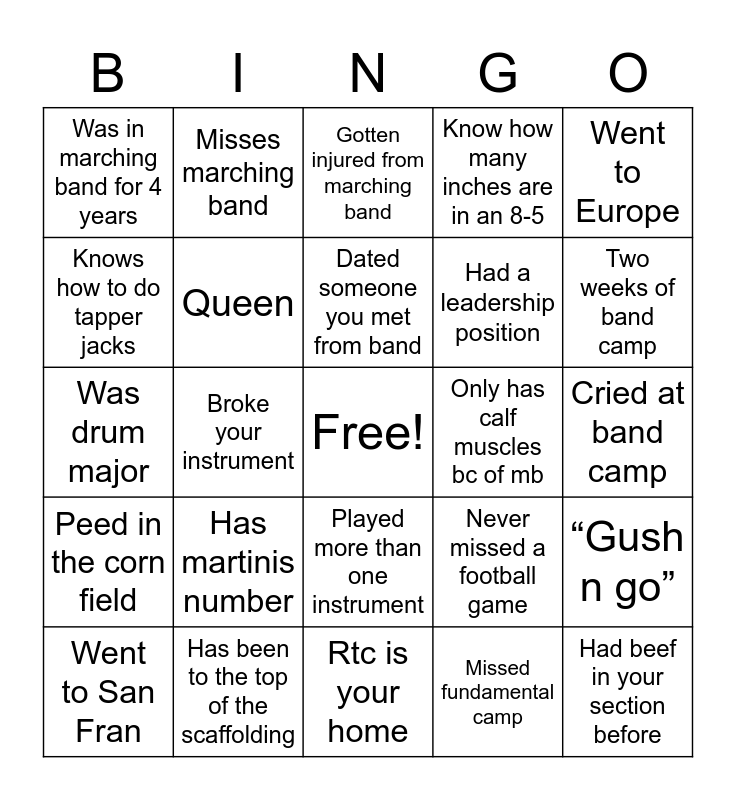 This bingo card has a free space and 24 words: Has martinis number, Has been to the top of the scaffolding, Dated someone you met from band, Went to San Fran, Went to Europe, Was in marching band for 4 years, Knows how to do tapper jacks, Misses marching band, Only has calf muscles bc of mb, Played more than one instrument, Had a leadership position, Was drum major, Never missed a football game, “Gush n go”, Queen, Missed fundamental camp, Cried at band camp, Gotten injured from marching band, Two weeks of band camp, Broke your instrument, Had beef in your section before, Peed in the corn field, Know how many inches are in an 8-5 and Rtc is your home.