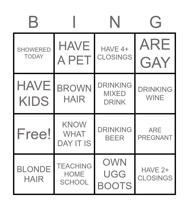 This bingo card has 16 words: BLONDE HAIR, TEACHING HOME SCHOOL, HAVE 4+ CLOSINGS, ARE GAY, HAVE KIDS, HAVE A PET, DRINKING BEER, ARE PREGNANT, SHOWERED TODAY, BROWN HAIR, OWN UGG BOOTS, DRINKING WINE, Free!, KNOW WHAT DAY IT IS, DRINKING MIXED DRINK and HAVE 2+ CLOSINGS.