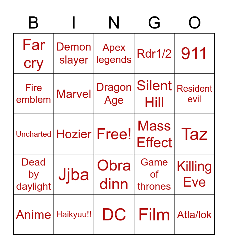 This bingo card has a free space and 24 words: Jjba, Haikyuu!!, Dragon Age, Anime, 911, Far cry, Fire emblem, Demon slayer, Mass Effect, Obra dinn, Silent Hill, Uncharted, Game of thrones, Killing Eve, Marvel, Film, Taz, Apex legends, Resident evil, Hozier, Atla/lok, Dead by daylight, Rdr1/2 and DC.