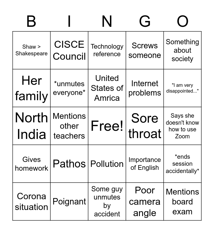 This bingo card has a free space and 24 words: Pathos, Poignant, United States of Amrica, Corona situation, Something about society, Shaw > Shakespeare, Her family, CISCE Council, Sore throat, Pollution, Internet problems, North India, Importance of English, *ends session accidentally*, *unmutes everyone*, Poor camera angle, Says she doesn't know how to use Zoom, Technology reference, "I am very disappointed...", Mentions other teachers, Mentions board exam, Gives homework, Screws someone and Some guy unmutes by accident.