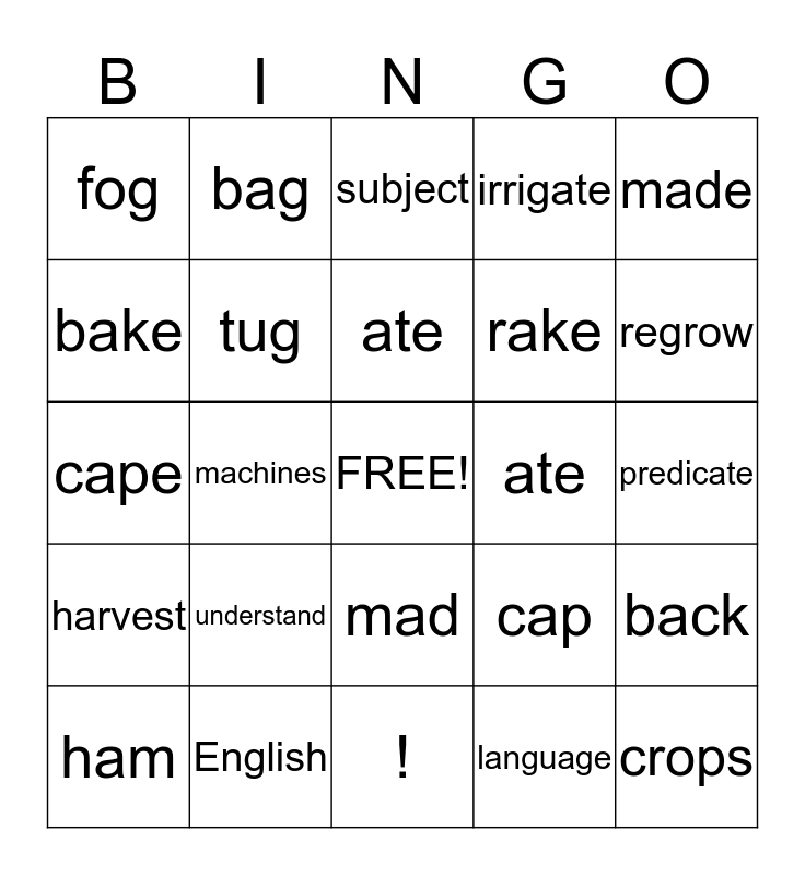 This bingo card has a free space and 24 words: understand, English, ate, ham, made, fog, bake, bag, ate, mad, rake, cape, cap, back, tug, language, predicate, subject, regrow, machines, crops, harvest, irrigate and !.