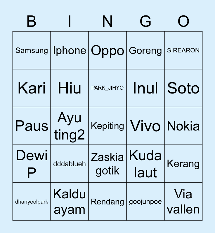 This bingo card has a free space and 24 words: dhanyeolpark, dddablueh, PARK_JIHYO, goojunpoe, SIREARON, Samsung, Iphone, Oppo, Vivo, Nokia, Paus, Hiu, Kuda laut, Kerang, Kari, Kaldu ayam, Rendang, Goreng, Soto, Dewi P, Ayu ting2, Zaskia gotik, Inul and Via vallen.