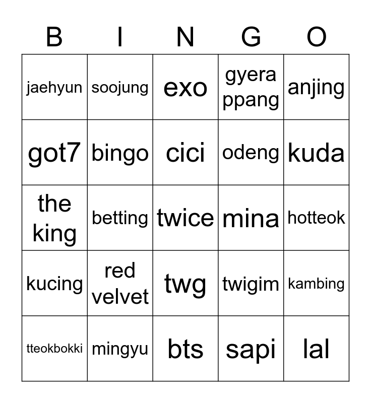 This bingo card has a free space and 24 words: red velvet, mingyu, cici, tteokbokki, anjing, jaehyun, got7, soojung, mina, twg, odeng, the king, twigim, kambing, bingo, sapi, hotteok, exo, kuda, betting, lal, kucing, gyera ppang and bts.