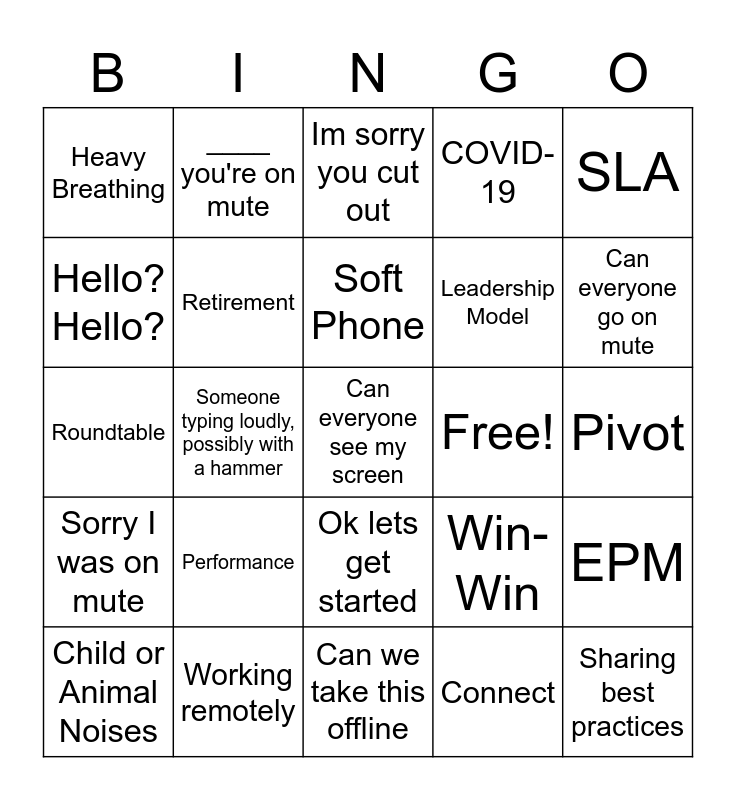 This bingo card has 25 words: Performance, Can we take this offline, Soft Phone, Child or Animal Noises, SLA, Heavy Breathing, Hello? Hello?, ____ you're on mute, Free!, Ok lets get started, Leadership Model, Roundtable, Win-Win, EPM, Retirement, Sharing best practices, Pivot, Im sorry you cut out, Can everyone go on mute, Someone typing loudly, possibly with a hammer, Can everyone see my screen, Working remotely, Sorry I was on mute, COVID-19 and Connect.