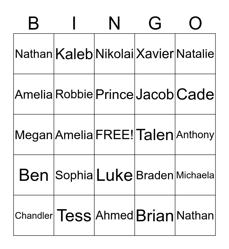 This bingo card has a free space and 24 words: Sophia, Tess, Prince, Chandler, Natalie, Nathan, Amelia, Kaleb, Talen, Luke, Jacob, Megan, Braden, Michaela, Robbie, Brian, Anthony, Nikolai, Cade, Amelia, Nathan, Ben, Xavier and Ahmed.