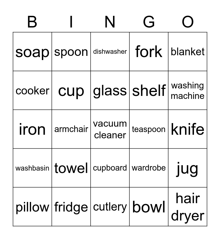 This bingo card has a free space and 24 words: towel, fridge, glass, pillow, blanket, soap, cooker, spoon, teaspoon, cupboard, shelf, iron, wardrobe, jug, cup, bowl, knife, dishwasher, washing machine, armchair, hair dryer, washbasin, fork and cutlery.