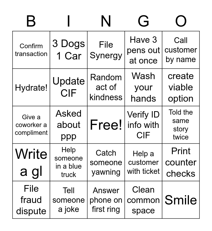 This bingo card has a free space and 24 words: File fraud dispute, Help someone in a blue truck, Random act of kindness, Clean common space, Call customer by name, Confirm transaction, 3 Dogs 1 Car, File Synergy, Verify ID info with CIF, Told the same story twice, Give a coworker a compliment, Update CIF, Help a customer with ticket, Print counter checks, Hydrate!, Tell someone a joke, Answer phone on first ring, Have 3 pens out at once, create viable option, Write a gl, Asked about ppp, Catch someone yawning, Wash your hands and Smile.