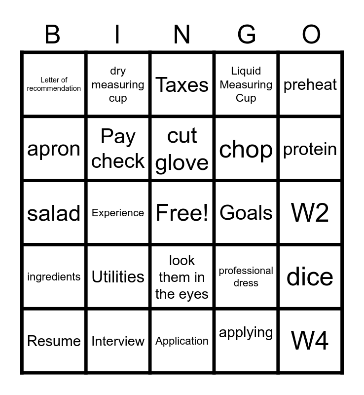 This bingo card has a free space and 29 words: Resume, Summary, Experience, References, Letter of recommendation, Taxes, Pay check, Utilities, Goals, Interview, W2, W4, Application, applying, protein, handshake, look them in the eyes, ingredients, preheat, salad, professional dress, boil, chop, apron, Liquid Measuring Cup, dry measuring cup, dice, cut glove and cross contamination.