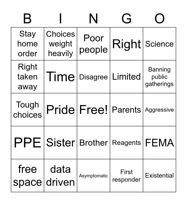 This bingo card has a free space and 43 words: Gas pump, Existential, Michigander, free space, Constitutional, First responder, Poor people, Low income, Science, data driven, Right, Parents, Brother, Sister, Frontline, Asymptomatic, Sacrifice, Tough choices, Got wrenching decisions, Banning public gatherings, Choices weight heavily, When the time is right, Carry out only, Stay home order, Medical minds, Aggressive, Testing, Swabs, Reagents, PPE, CDC, FEMA, Foodon the table, Pride, Disappointed, Stepped up, masks, Disagree, Right taken away, Limited, Action, Time and When the time is right.