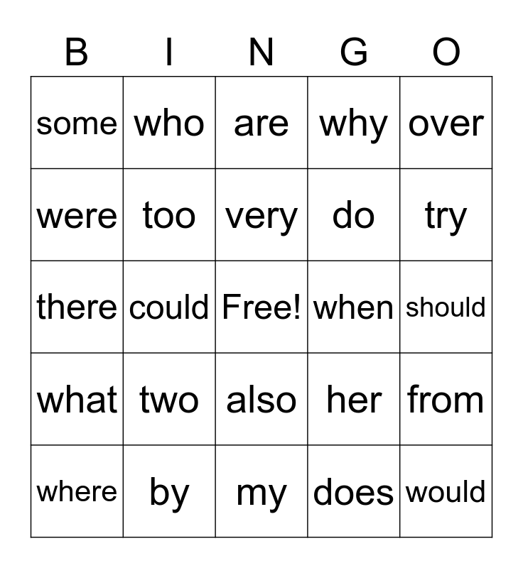 This bingo card has a free space and 28 words: from, have, do, does, were, are, who, what, when, where, there, why, by, my, try, put, two, too, very, also, some, come, would, could, should, her, over and number.