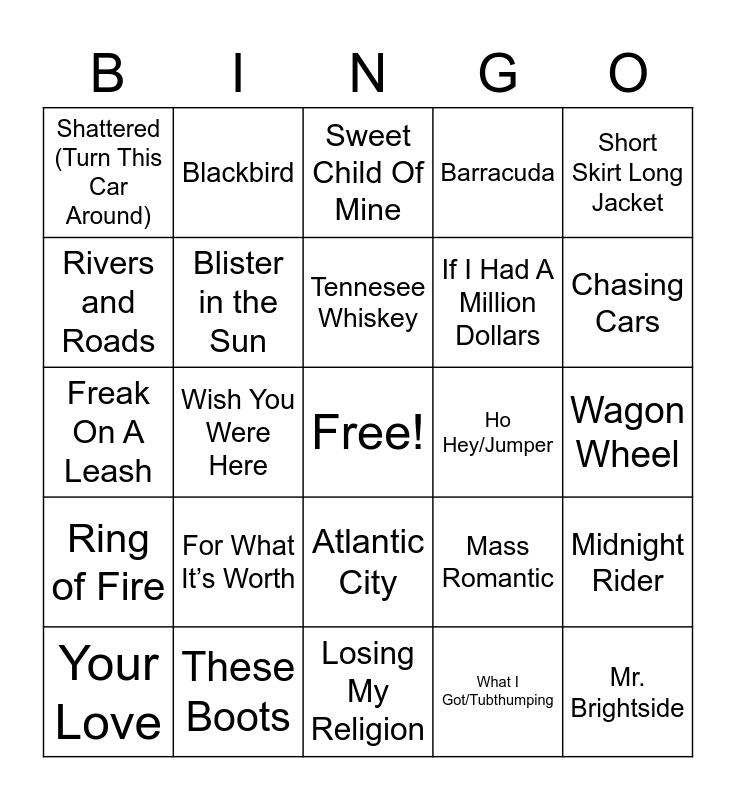 This bingo card has a free space and 25 words: For What It’s Worth, Losing My Religion, Tennesee Whiskey, Your Love, Short Skirt Long Jacket, Shattered (Turn This Car Around), Rivers and Roads, Blackbird, Ho Hey/Jumper, Atlantic City, If I Had A Million Dollars, Freak On A Leash, Mass Romantic, Midnight Rider, Blister in the Sun, Use Somebody, Wagon Wheel, Sweet Child Of Mine, Chasing Cars, Wish You Were Here, Mr. Brightside, These Boots, Ring of Fire, Barracuda and What I Got/Tubthumping.