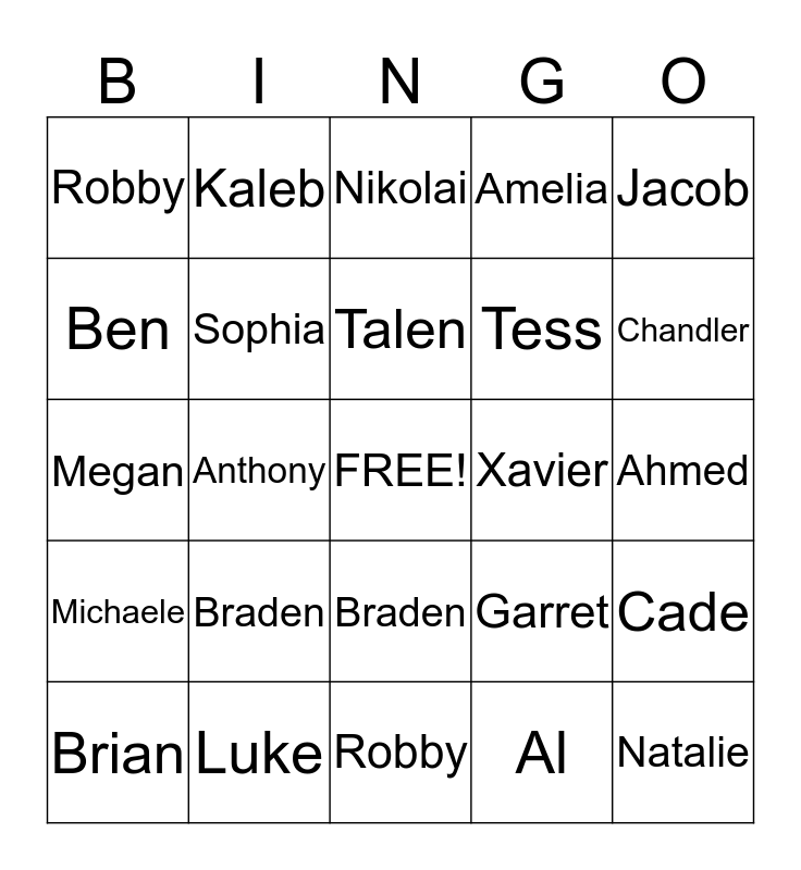 This bingo card has a free space and 24 words: Braden, Luke, Talen, Brian, Jacob, Robby, Ben, Kaleb, Xavier, Braden, Tess, Megan, Garret, Cade, Sophia, Al, Ahmed, Nikolai, Chandler, Anthony, Natalie, Michaele, Amelia and Robby.
