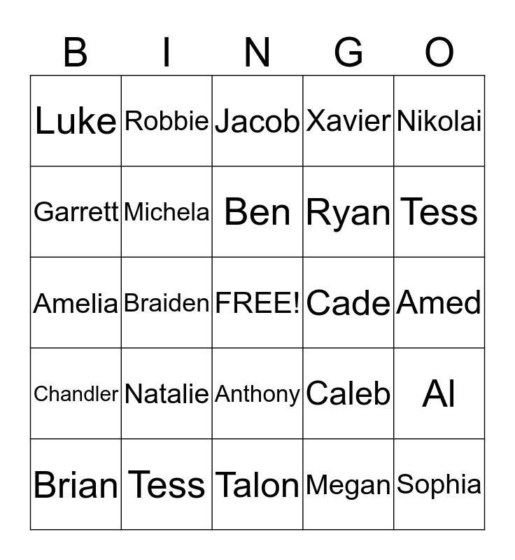 This bingo card has a free space and 24 words: Natalie, Tess, Ben, Brian, Nikolai, Luke, Garrett, Robbie, Cade, Anthony, Ryan, Amelia, Caleb, Al, Michela, Megan, Amed, Jacob, Tess, Braiden, Sophia, Chandler, Xavier and Talon.