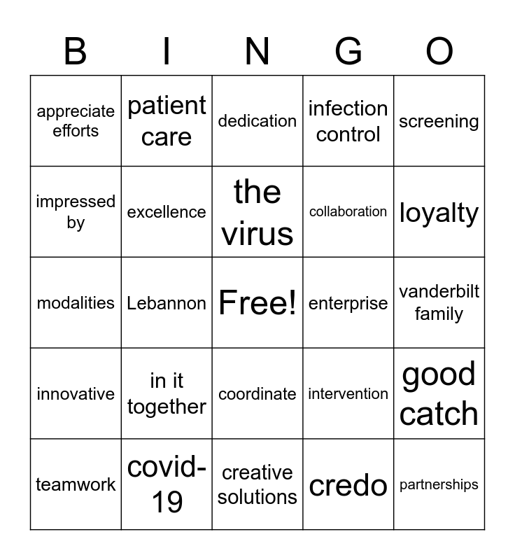 This bingo card has a free space and 24 words: in it together, covid-19, the virus, teamwork, screening, appreciate efforts, impressed by, patient care, enterprise, coordinate, collaboration, modalities, intervention, good catch, excellence, credo, vanderbilt family, dedication, loyalty, Lebannon, partnerships, innovative, infection control and creative solutions.