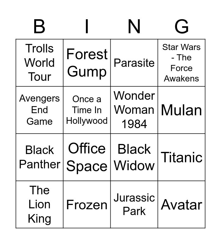 This bingo card has 40 words: James Bond - No Time To Die, Black Widow, Top Gun - Maverick, Wonder Woman 1984, Minions, Peter Rabbit, Mulan, Fast & Furious 9, Avengers End Game, Avatar, Titanic, Star Wars - The Force Awakens, The Lion King, Jurassic Park, Frozen, The Joker, Ghostbusters, Trolls World Tour, Shrek, Parasite, The Godfather, Taxi Driver, Black Panther, Once a Time In Hollywood, S.C.O.O.B, Sonic The Hedgehog, Legally Blond 3, Once Were Warriors, Whale Rider, Hunt For The Wilderpeople, Boy, Lord Of The Rings, Borat, The 40 Year Old Virgin, Office Space, Super Troopers, Anchor Man, Jaws, Forest Gump and The Wizard Of.