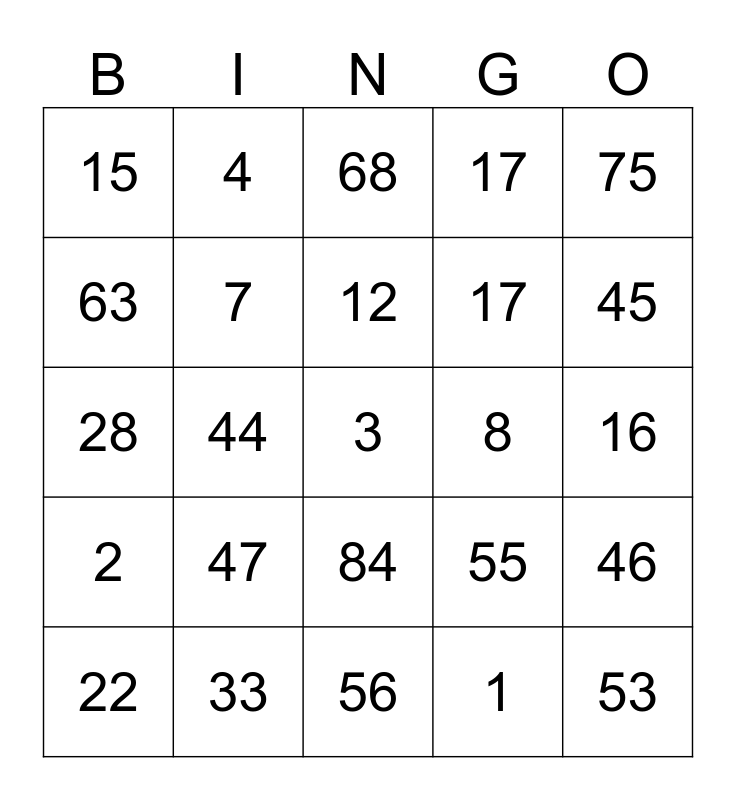 This bingo card has a free space and 24 words: 47, 33, 12, 22, 75, 15, 63, 4, 8, 84, 17, 28, 55, 46, 7, 1, 16, 68, 45, 44, 53, 2, 17 and 56.