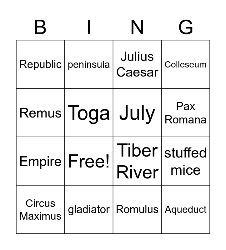 This bingo card has 16 words: gladiator, stuffed mice, Julius Caesar, Republic, Empire, peninsula, Tiber River, Romulus, Remus, Toga, Circus Maximus, Colleseum, Free!, Pax Romana, July and Aqueduct.