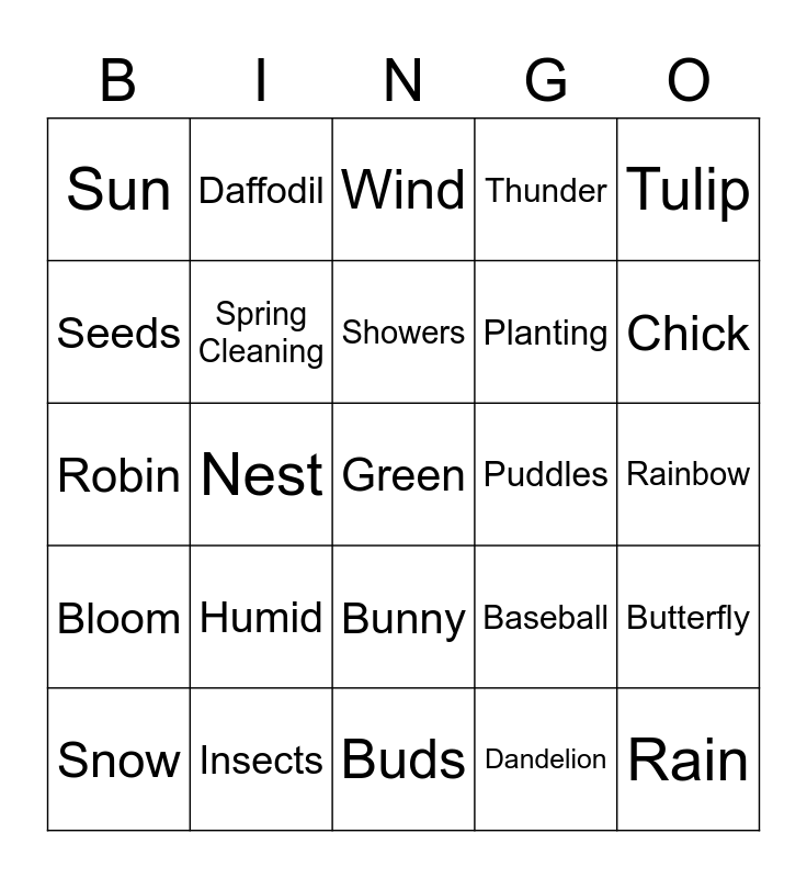 This bingo card has a free space and 30 words: Free!, Insects, Wind, Lightening, Tulip, Sun, Spring Cleaning, Showers, Planting, Rain, Snow, Humid, Dandelion, Rainbow, Bloom, Grass, Buds, Puddles, Butterfly, Seeds, Nest, Umbrella, Thunder, Rainbow, Robin, Daffodil, Bunny, Baseball, Chick and Sprout.