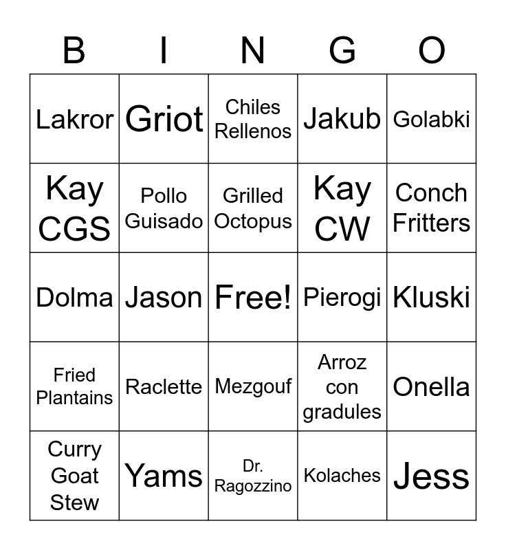 This bingo card has a free space and 34 words: Quzi, Kolaches, Carne en su Jugo, Tave Kosi, Fried Plantains, Pollo Guisado, Golabki, Curry Goat Stew, Griot, Sopes, Grilled Octopus, Chiles Rellenos, Jollof Rice, Arancini, Pierogi, Conch Fritters, Yams, Dolma, Raclette, Arroz con gradules, Mezgouf, Ratatouille, Lakror, Kluski, Dr. Ragozzino, Jess, Jakub, Anna, Kay CW, Kay CGS, Pamela, Jason, Onella and Marina.