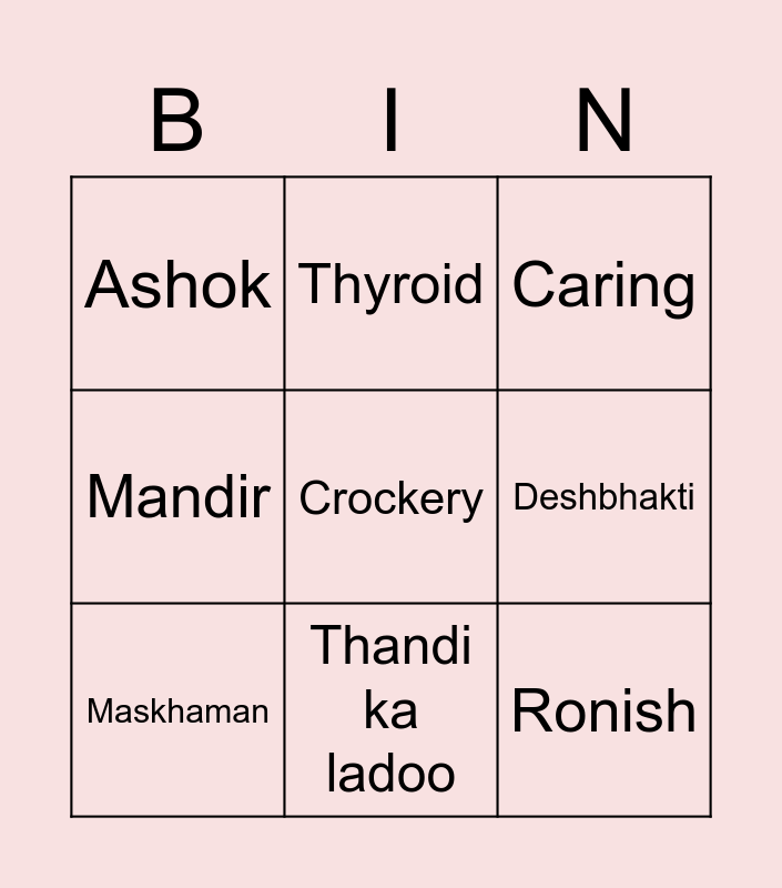 This bingo card has a free space and 8 words: Deshbhakti, Caring, Thyroid, Maskhaman, Ashok, Ronish, Mandir and Thandi ka ladoo.