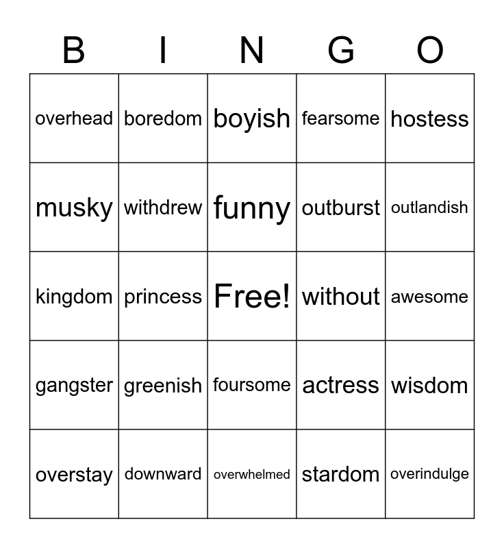 This bingo card has a free space and 34 words: handsome, stardom, ticklish, friendship, gangster, withdrew, hostess, overstay, boredom, outdoor, funny, boyish, tiresome, freedom, without, outlandish, downward, kingdom, greenish, actress, foursome, fitness, overhead, awesome, overwhelmed, overindulge, fearsome, creepy, outburst, musky, darkness, princess, wisdom and waitress.