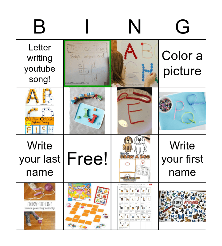 This bingo card has 11 images and 5 words: Write your first name, Letter writing youtube song!, Write your last name, Color a picture and Free!.