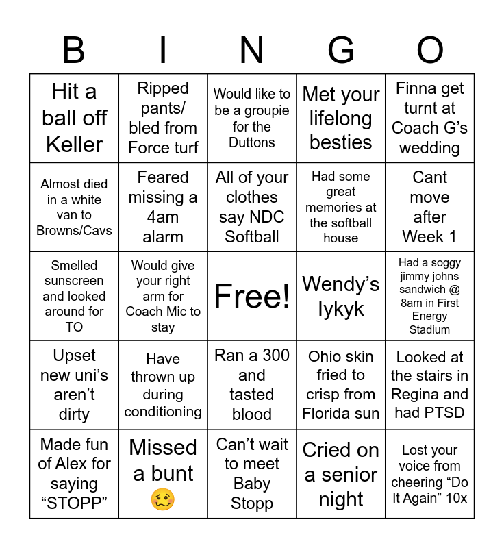 This bingo card has a free space and 24 words: Have thrown up during conditioning, Missed a bunt 🥴, All of your clothes say NDC Softball, Made fun of Alex for saying “STOPP”, Finna get turnt at Coach G’s wedding, Hit a ball off Keller, Almost died in a white van to Browns/Cavs, Ripped pants/ bled from Force turf, Wendy’s Iykyk, Ran a 300 and tasted blood, Had some great memories at the softball house, Smelled sunscreen and looked around for TO, Ohio skin fried to crisp from Florida sun, Looked at the stairs in Regina and had PTSD, Feared missing a 4am alarm, Cried on a senior night, Had a soggy jimmy johns sandwich @ 8am in First Energy Stadium, Would like to be a groupie for the Duttons, Cant move after Week 1, Would give your right arm for Coach Mic to stay, Lost your voice from cheering “Do It Again” 10x, Upset new uni’s aren’t dirty, Met your lifelong besties and Can’t wait to meet Baby Stopp.
