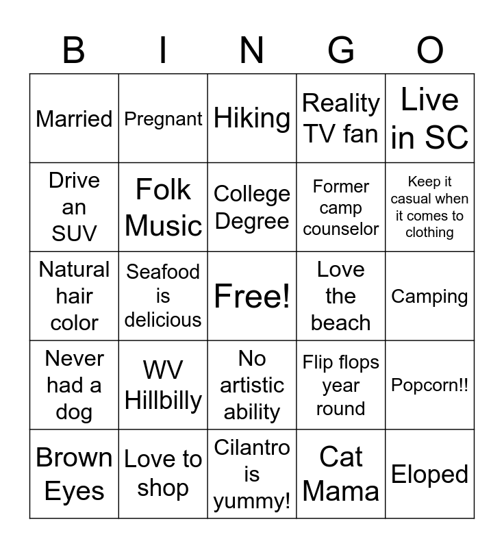 This bingo card has a free space and 24 words: Brown Eyes, WV Hillbilly, College Degree, Cat Mama, Live in SC, Married, Pregnant, Hiking, Love the beach, Camping, Natural hair color, Folk Music, Flip flops year round, Popcorn!!, Drive an SUV, Love to shop, Cilantro is yummy!, Reality TV fan, Keep it casual when it comes to clothing, Never had a dog, Seafood is delicious, No artistic ability, Former camp counselor and Eloped.