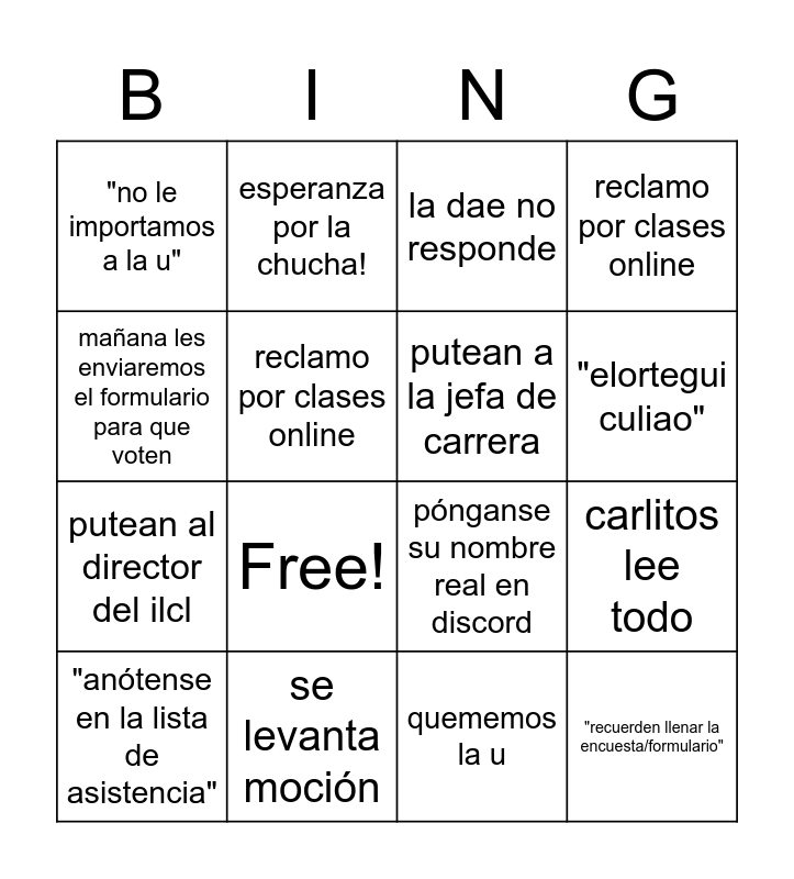 This bingo card has 16 words: se levanta moción, carlitos lee todo, la dae no responde, "no le importamos a la u", putean al director del ilcl, esperanza por la chucha!, pónganse su nombre real en discord, quememos la u, mañana les enviaremos el formulario para que voten, reclamo por clases online, "anótense en la lista de asistencia", reclamo por clases online, Free!, "elortegui culiao", putean a la jefa de carrera and "recuerden llenar la encuesta/formulario".