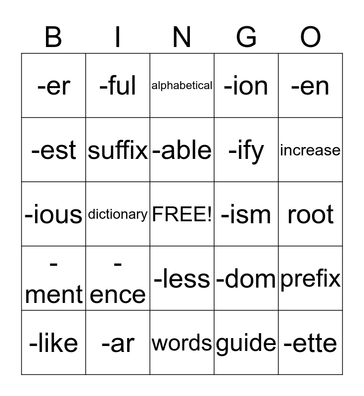 This bingo card has a free space and 24 words: -ence, -ar, -able, -like, -en, -er, -est, -ful, -ism, -less, -ify, -ious, -dom, prefix, suffix, guide, root, alphabetical, increase, dictionary, -ette, -ment, -ion and words.