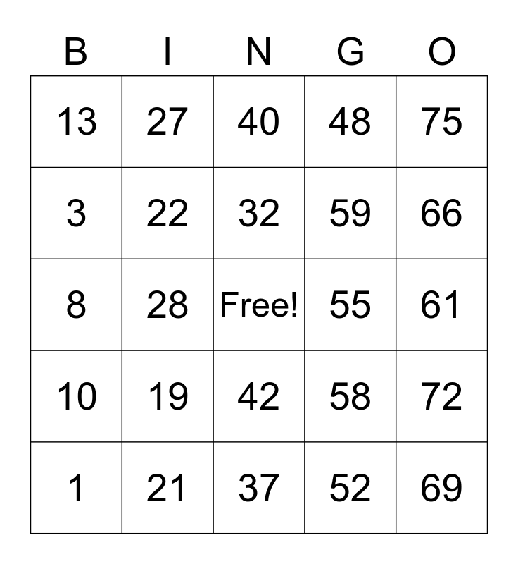 This bingo card has a free space and 24 words: 1, 19, 32, 52, 75, 13, 27, 40, 55, 61, 8, 22, 58, 72, 3, 21, 37, 48, 66, 10, 28, 42, 59 and 69.