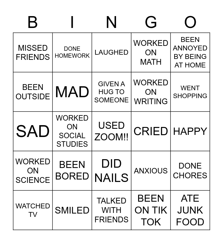 This bingo card has a free space and 24 words: WATCHED TV, BEEN BORED, GIVEN A HUG TO SOMEONE, BEEN ON TIK TOK, BEEN ANNOYED BY BEING AT HOME, MISSED FRIENDS, DONE HOMEWORK, LAUGHED, CRIED, HAPPY, SAD, MAD, ANXIOUS, DONE CHORES, BEEN OUTSIDE, SMILED, TALKED WITH FRIENDS, WORKED ON MATH, WENT SHOPPING, WORKED ON SCIENCE, WORKED ON SOCIAL STUDIES, DID NAILS, WORKED ON WRITING and ATE JUNK FOOD.